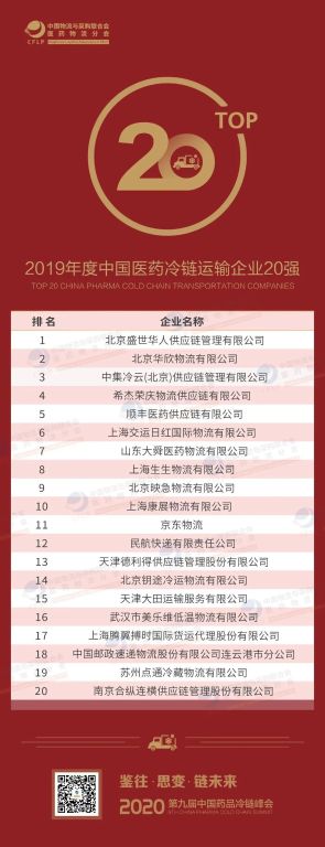 華欣物流榮獲“2019年度中國醫(yī)藥冷鏈運輸企業(yè)20強”